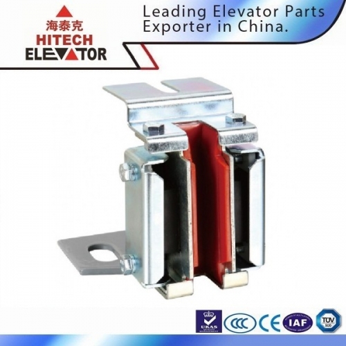 Guide rail and the elevator car boots are slidable between a nylon block, called the guide shoe, which can be fixed to the rail car, so the car can only move up and down, the guide shoe upper and the oil cup, reduce shoe lining friction of the guide rail Install four each elevator car guide shoes, were installed in the car on the sides and bottom of the beam seat safety gear below; four counterweight guide shoes mounted on the bottom of the counterweight and the upper beam.