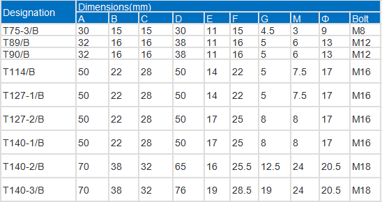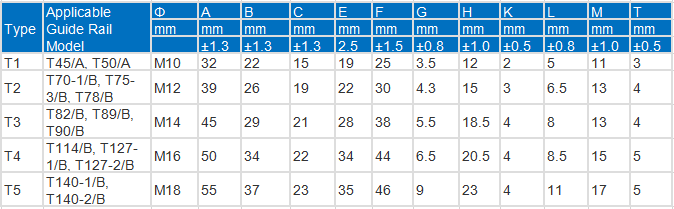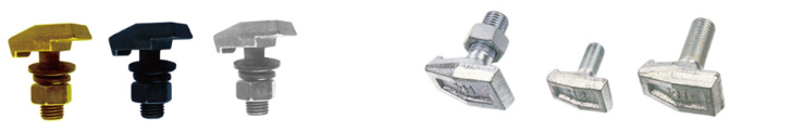 Note: T-Type forged clips are made exactly according to customers' design, which are suitable for T45/A to T140 Rail etc. Each full set of T type clips include four parts: T Bolt, Nut, Plain Washer and Lock Washer, and its finish options include plain (self colored), galvanized or zinc plated. Product threading can be offered in UNC, UNF or metric.
